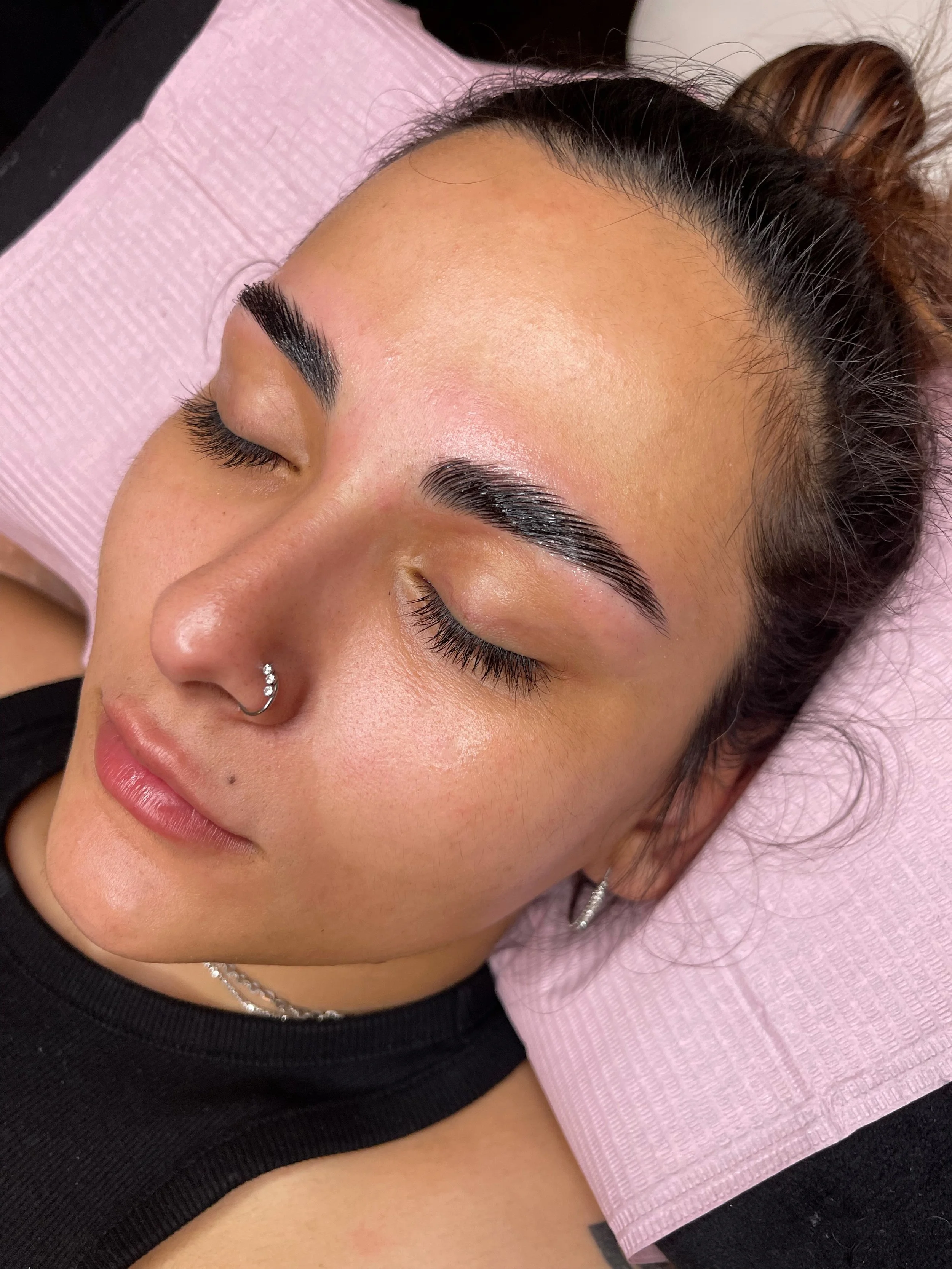 A brow-enhancing treatment that smooths, lifts, and sets the brow hairs into a fuller, more defined shape. This service creates a polished, brushed-up look that helps correct unevenness, add symmetry, and give the appearance of thicker brows without makeup.